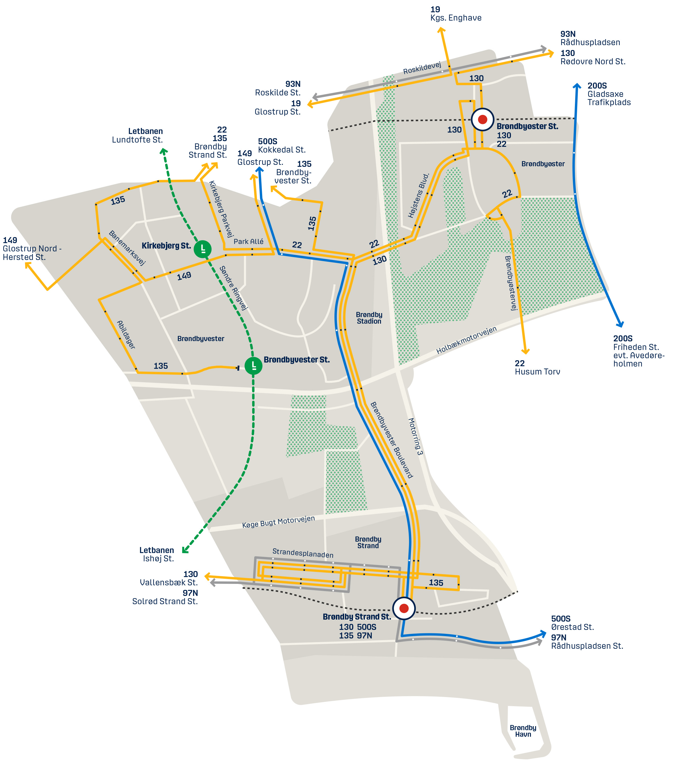 Når Nyt Ringnet træder i kraft, vil den nye buslinje 135 køre mellem den nye letbanestation, Brøndbyvester St. og Brøndby Strand St. På sin rute vil buslinjen betjene Ragnesminde, Vesterled, Glostrup St., Brøndby Rådhus, Brøndby Stadion og Strandesplanaden. På den måde bliver boligområderne i Brøndby Kommune bundet bedre sammen. Buslinjen erstatter linje 166 mellem Brøndby Strand og Glostrup og linje 22 vest for Glostrup st.